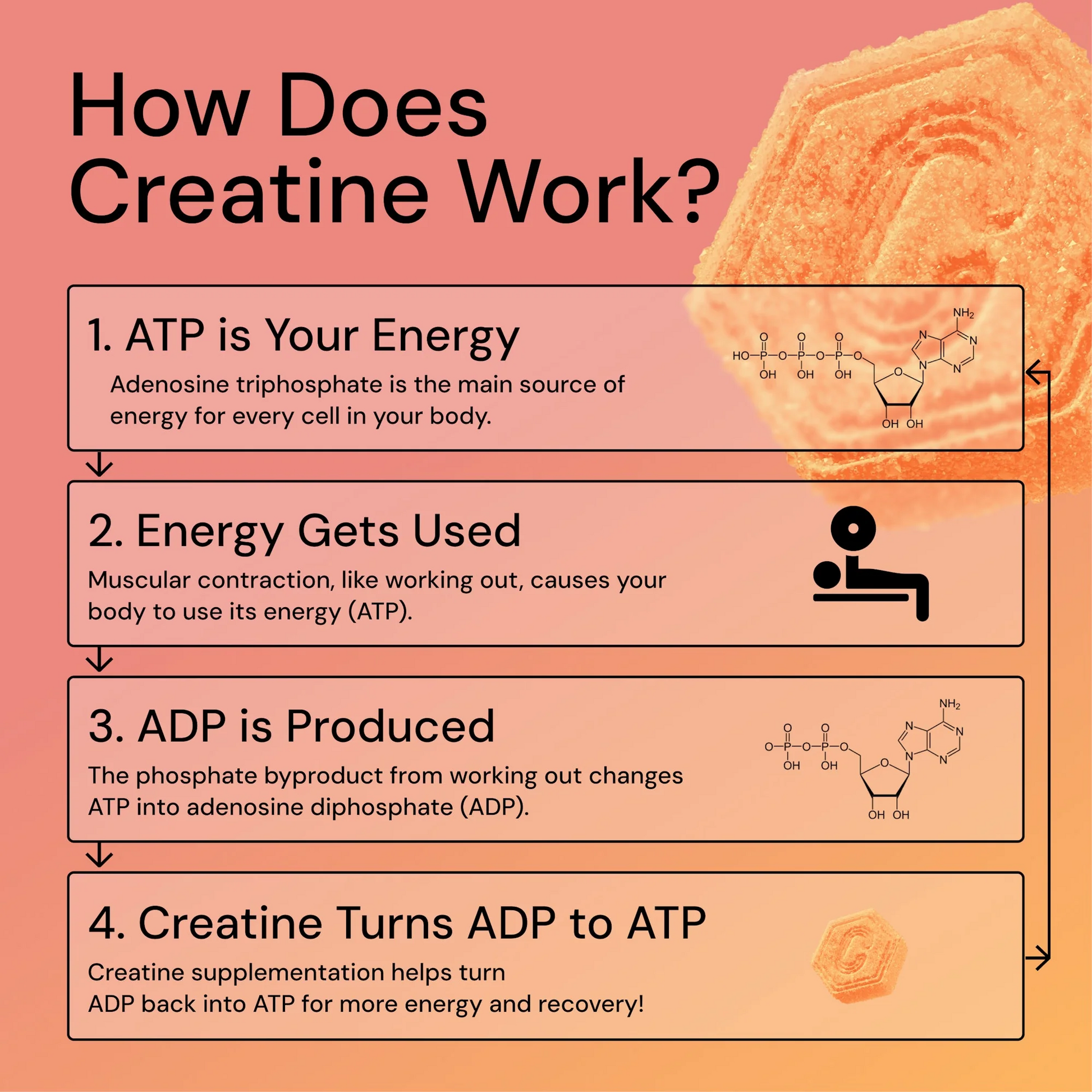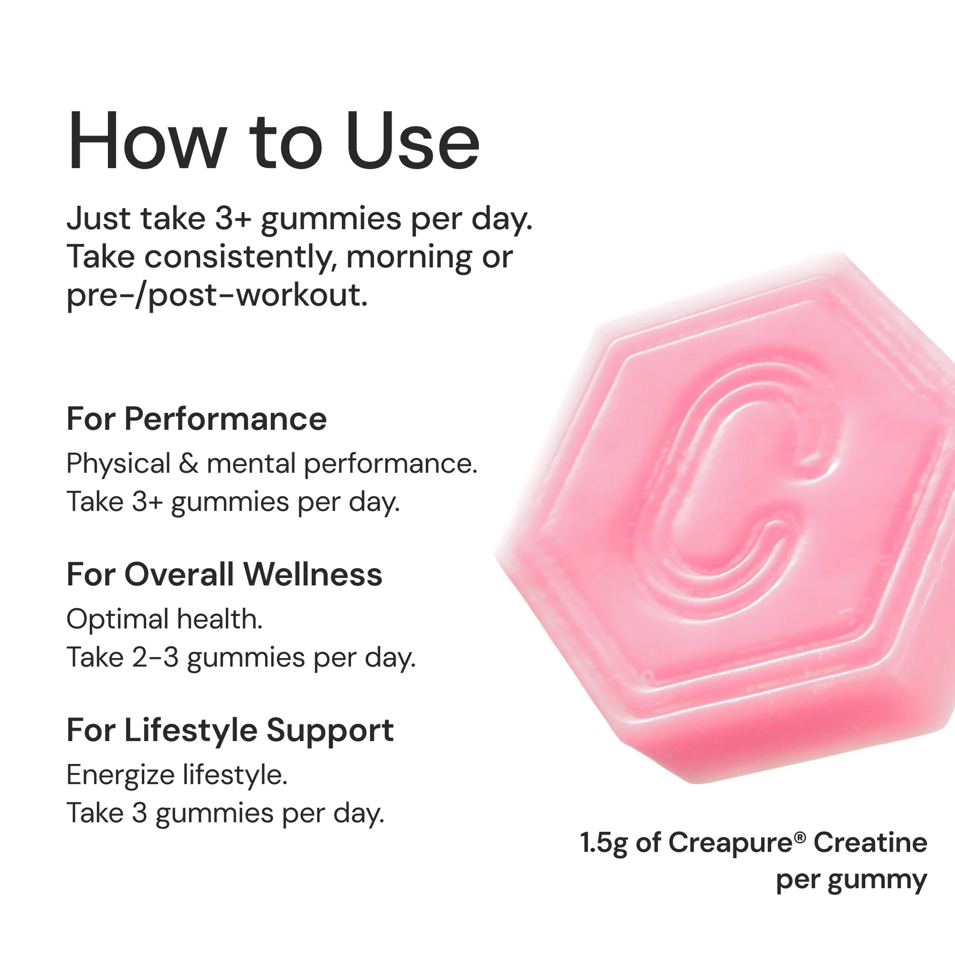 For gummies: To experience the full benefits of proper creatine supplementation, we recommend taking 3-5 gummies once per day, every day. If you are using our gummies as a dietary replacement supplement, 1-2 gummies once per day matches the average daily meat-based diet.